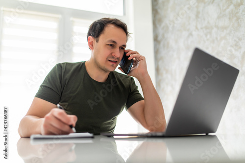 Handsome young man calculate bills make notice using laptop and talking on cellphone in kitchen.