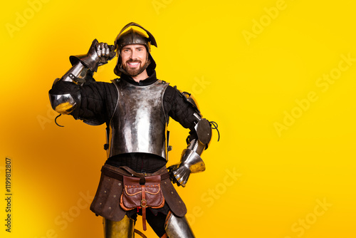 Handsome young man dressed in medieval knight armor posing against a vibrant yellow background showing confidence and humor