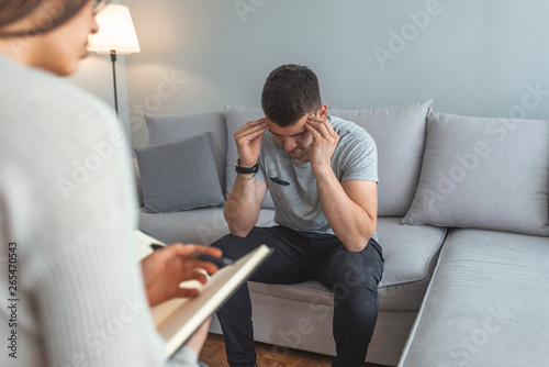 Handsome young man is sitting on couch and talking to the psychologist while doctor is making notes. Young man consulting with medical doctor or psychologist, complaining about health