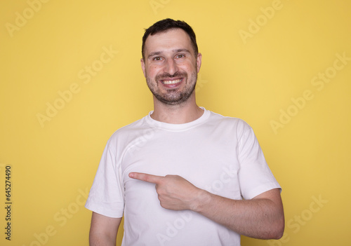 Handsome young man point by finger right side with happy face looking at camera on yellow isolated background.