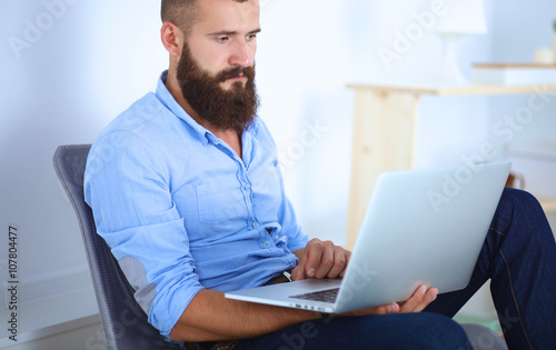 Handsome young man sitting and working on laptop computer
