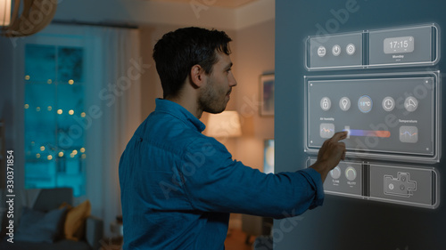 Handsome Young Man Walks Over to a Refrigerator. He is Changing Temperature on Smart Fridge Screen at Home. Cozy Kitchen Evening.