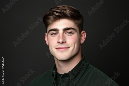 Handsome young man with short dark hair and dimples in a dark studio setting. Charismatic appeal