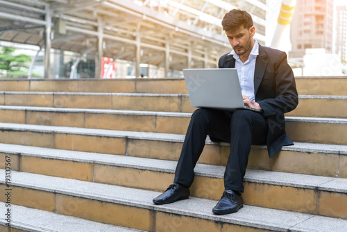 Handsome young manager working on laptop computer while sitting outdoors on the stairs, concept of technology and communication.