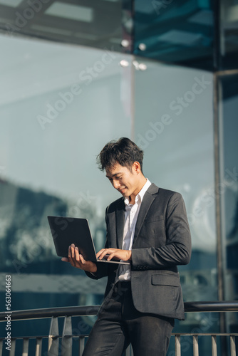 Handsome young manager working on laptop while sitting outdoors on the stairs, concept of work life balance.