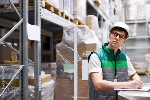 handsome young warehouse worker with list checking stock condition, man in uniform at work
