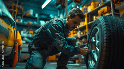 Hands-on Car Care: Mechanic Installing New Wheel in Garage