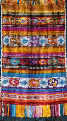 Handwoven Chilean textile displayed outdoors highlights skilled craftsmanship and rich colors