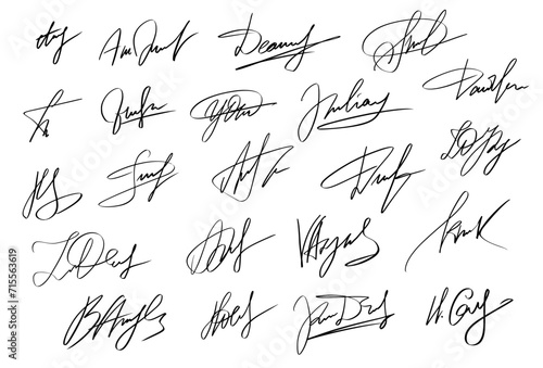 Handwriting Autograph set. Personal fictitious signature calligraphy lettering. Scrawl imaginary name for document. Vector illustration on white background