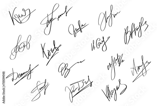 Handwriting Autograph set. Personal fictitious signature calligraphy lettering. Scrawl imaginary name for document. Vector illustration on white background