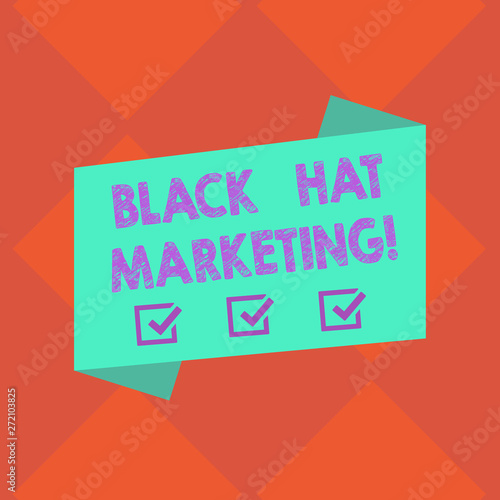 Handwriting text Black Hat Marketing. Concept meaning Search optimization involves design site be found easily Blank Color Folded Banner Strip Flat Style photo for Announcement Poster
