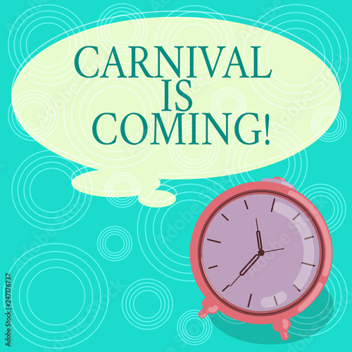 Handwriting text Carnival Is Coming. Concept meaning public festival which showing play music and dance Blank Color Thought Speech Bubble with Outline and Alarm Clock photo