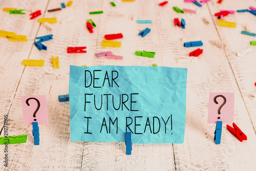 Handwriting text Dear Future I Am Ready. Conceptual photo suitable state for action or situation being fully prepared Scribbled and crumbling sheet with paper clips placed on the wooden table