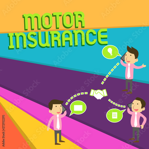 Handwriting text Motor Insurance. Concept meaning Provides financial compensation to cover any injuries Businessmen Coworkers Conference Call Conversation Discussion Mobile Phones.