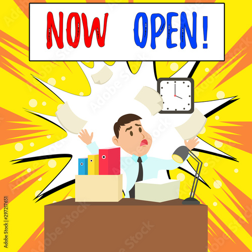 Handwriting text Now Open. Conceptual photo leave door or windows not closed or barred at this current time Confused Male Employee Manager Cluttered Workspace Overflow Time Shortage