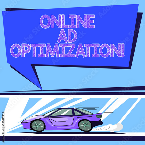 Handwriting text Online Ad Optimization. Concept meaning Improving the perforanalysisce of a text PPC advertisement Car with Fast Movement icon and Exhaust Smoke Blank Color Speech Bubble