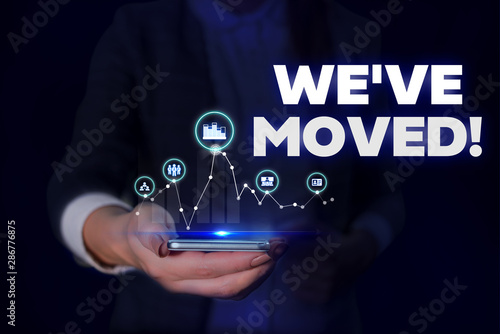 Handwriting text We Ve Moved. Conceptual photo having strong feelings sadness or sympathy has said or done Woman wear formal work suit presenting presentation using smart device