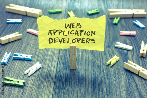 Handwriting text Web Application Developers. Concept meaning Internet programming experts Technology software Paperclip hold written torn page many clips laid on bluish wooden floor