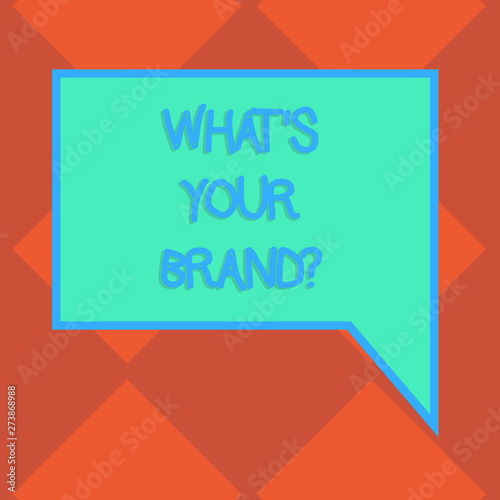 Handwriting text What S Your Brandquestion. Conceptual photo Define Individual trademark Identify Company Blank Rectangular Color Speech Bubble with Border photo Right Hand