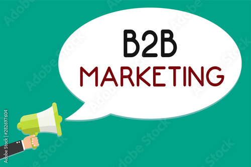 Handwriting text writing B2B Marketing. Concept meaning Partnership Companies Supply Chain Merger Leads Resell Man holding megaphone loudspeaker speech bubble message speaking loud