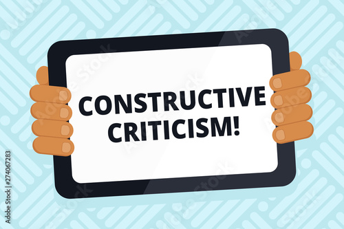 Handwriting text writing Constructive Criticism. Concept meaning process of offering valid and well reasoned opinions Color Tablet Smartphone with Blank Screen Handheld from the Back of Gadget.
