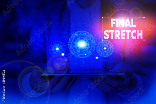 Handwriting text writing Final Stretch. Conceptual photo Last Leg Concluding Round Ultimate Stage Finale Year ender Woman wear formal work suit presenting presentation using smart device