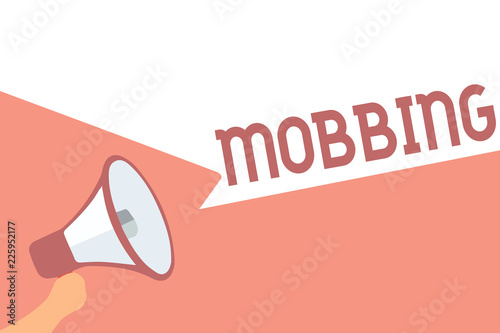Handwriting text writing Mobbing. Concept meaning Bulling of individual specially at work Emotional abuse Stress Megaphone loudspeaker speech bubbles important message speaking out loud