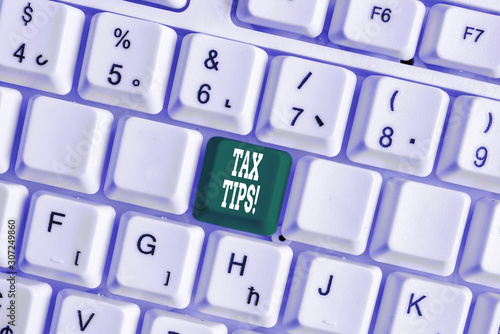 Handwriting text writing Tax Tips. Conceptual photo compulsory contribution to state revenue levied by government White pc keyboard with empty note paper above white background key copy space
