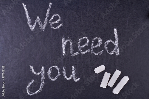 Handwritten chalk inscription We need you on black board. Asking someone to work together.