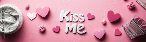 Handwritten Playful Message "Kiss Me" With Hearts and Whipped Cream on Soft Pink Background
