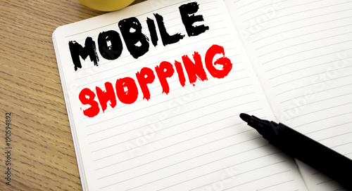 Handwritten text caption showing Mobile Shopping. Business concept writing for Cellphone online order written on notebook with copy space on book background with marker pen