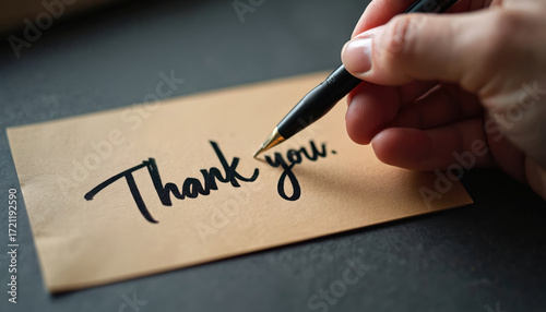 Handwritten thank you note for loyal customer. Person writes message on card, black pen. Small business appreciates customer loyalty, showing appreciation. Customer service, gratitude.