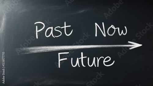 Handwritten words illustrating past, now, and future on a chalkboard with an arrow indicating a direction.
