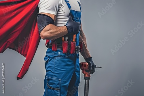 Handyman dressed as superhero with red cape, holding drill and tool belt, ready for action.