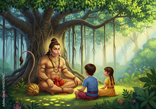 Hanuman Telling Ramayana Stories to Children Under Banyan Tree