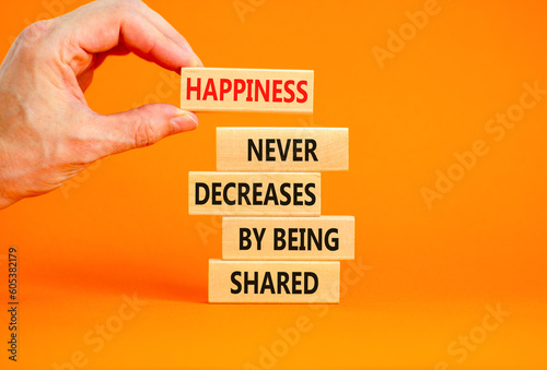 Happiness symbol. Concept words Happiness never decreases by being shared on wooden block. Businessman hand. Beautiful orange table orange background Motivational Happiness concept. Copy space.