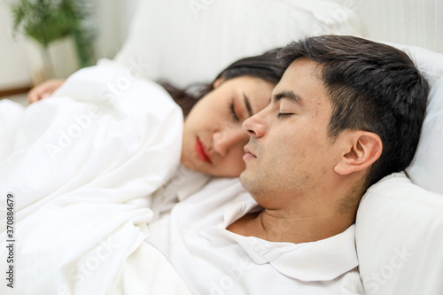 Happiness young couple lover sleeping and relaxation on bedroom.