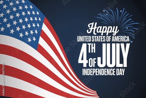 Happy 4th of July Independence Day banner with waving American flag and fireworks, patriotic USA art.