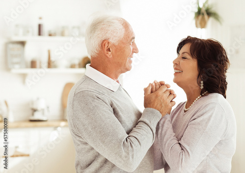 Happy active elderly senior couple dancing in kitchen. Lifestyle and old people concept.