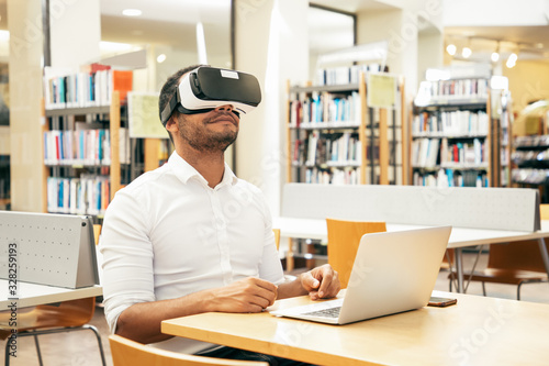 Happy adult male student enjoying VR experience in library. Man wearing virtual reality glasses, sitting at desk with laptop and smiling. Virtual video concept