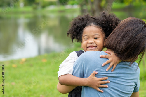 Happy affectionate mixed race family. Cute little child girl embrace her mother with toothy smile. Mom and daughter bonding spending time together and enjoy in summer outdoor weekend holiday vacation.