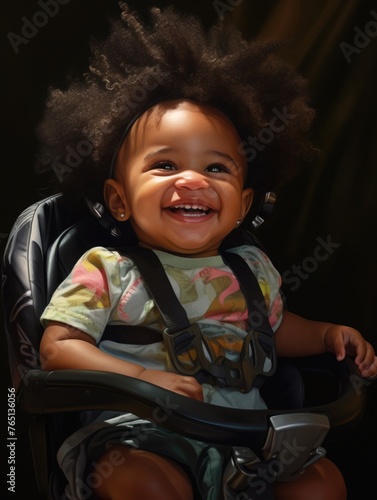 Happy african american baby in car seat. child with afro hairstyle looking at camera