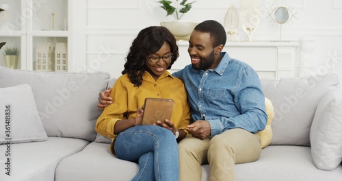 Happy African American couple husband and wife sitting on sofa using tablet and credit card for online shopping at home.