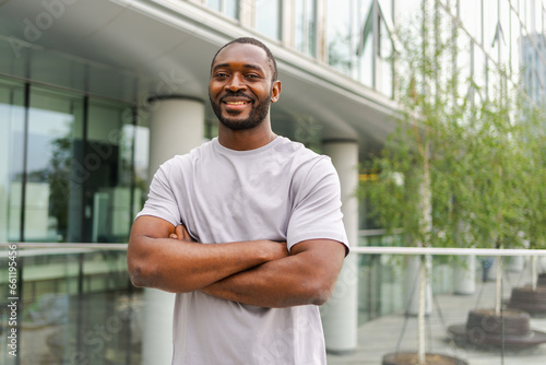 Happy african american man smiling outdoor. Portrait of young happy man on street in city. Cheerful joyful handsome person guy looking at camera. Freedom happiness carefree happy people concept