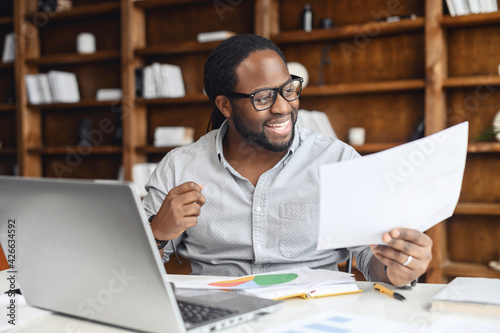 Happy African-American businessman in eyeglasses looks at a document, satisfied with report results, analyzing raising of sales graphs, doing paperwork, glad to see good project result, a laptop near