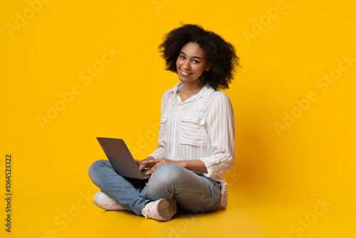Happy afro woman sitting on floor, using laptop and smiling at camera, posing over yellow studio background with copy space