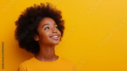 Happy and confident African American Gen Z teen girl standing against a bright yellow wall, wearing a joyful smile. She gazes off into the distance, daydreaming, and radiating posi