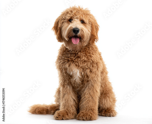 Happy and content cute brown golden doodle dog sits gracefully, showcasing its fluffy coat and playful demeanor. This adorable pet radiates joy and warmth