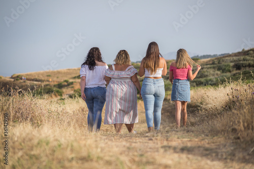 happy and modern friends stroll through a meadow