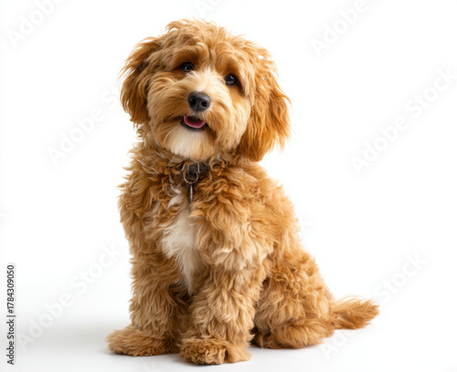 Happy and playful full body golden brown cavoodle sits gracefully, showcasing its fluffy coat and friendly expression. This adorable dog exudes warmth and charm, making it delightful companion